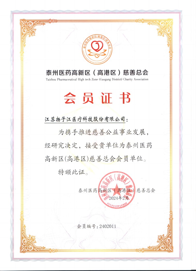 泰州醫(yī)藥高新區(qū)(高港區(qū))慈善總會會員單位證書